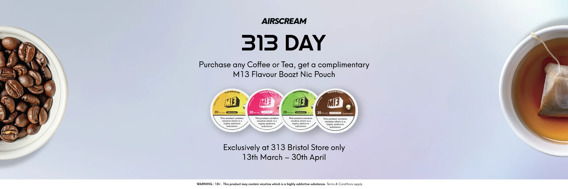 From 13 March to 30 April, visitors who purchase any coffee or tea at the 313 by AIRSCREAM store in Bristol, England, will receive a complimentary M13 Flavour Boozt Nic Pouch, available while stocks last.